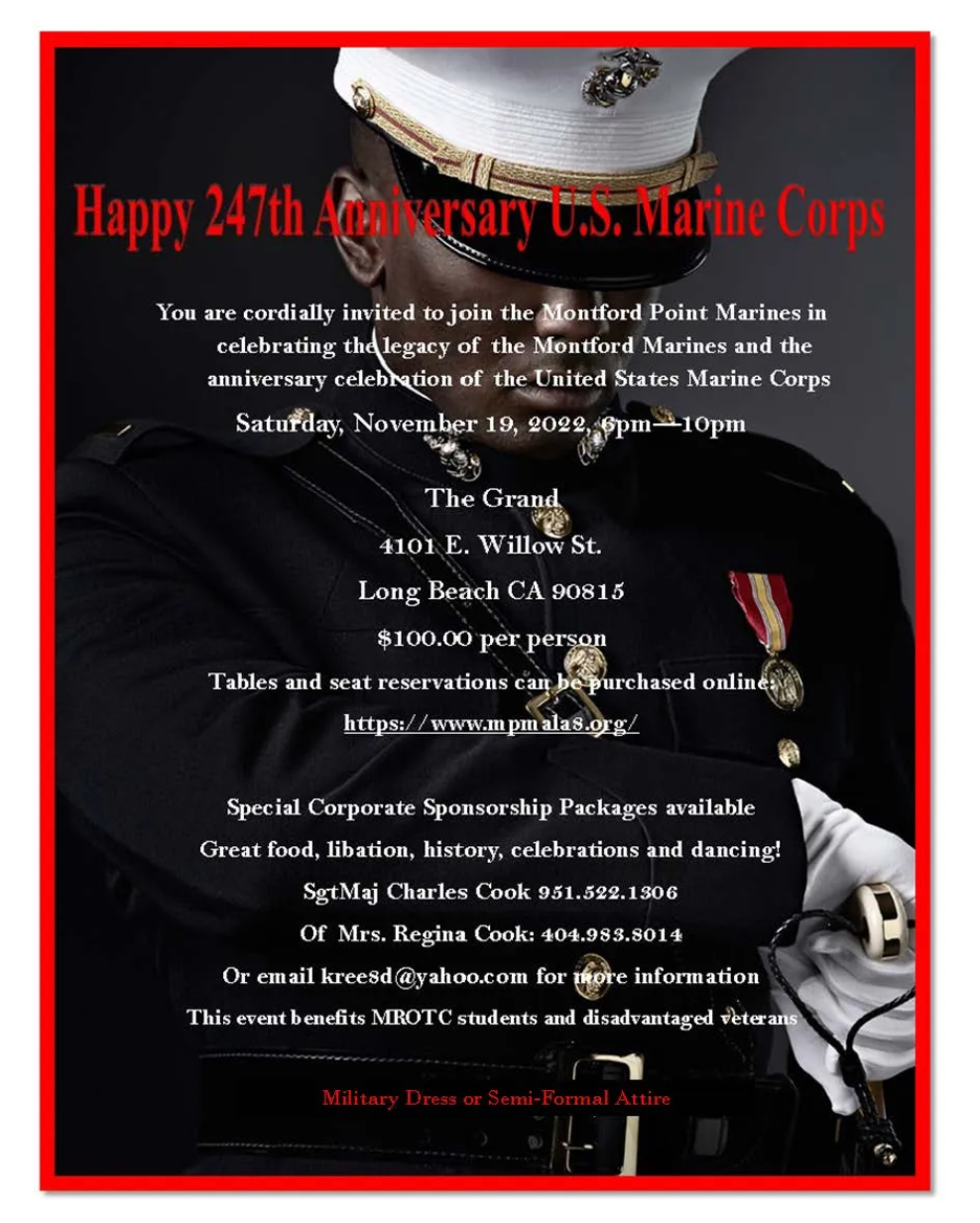 Please join Los Angeles Chapter 8 of the National Montford Point Marine Association in celebrating the 247th Birthday of the United States Marine Corps. Keynote speaker: Colonel Riccoh Player, USMC (Ret.).